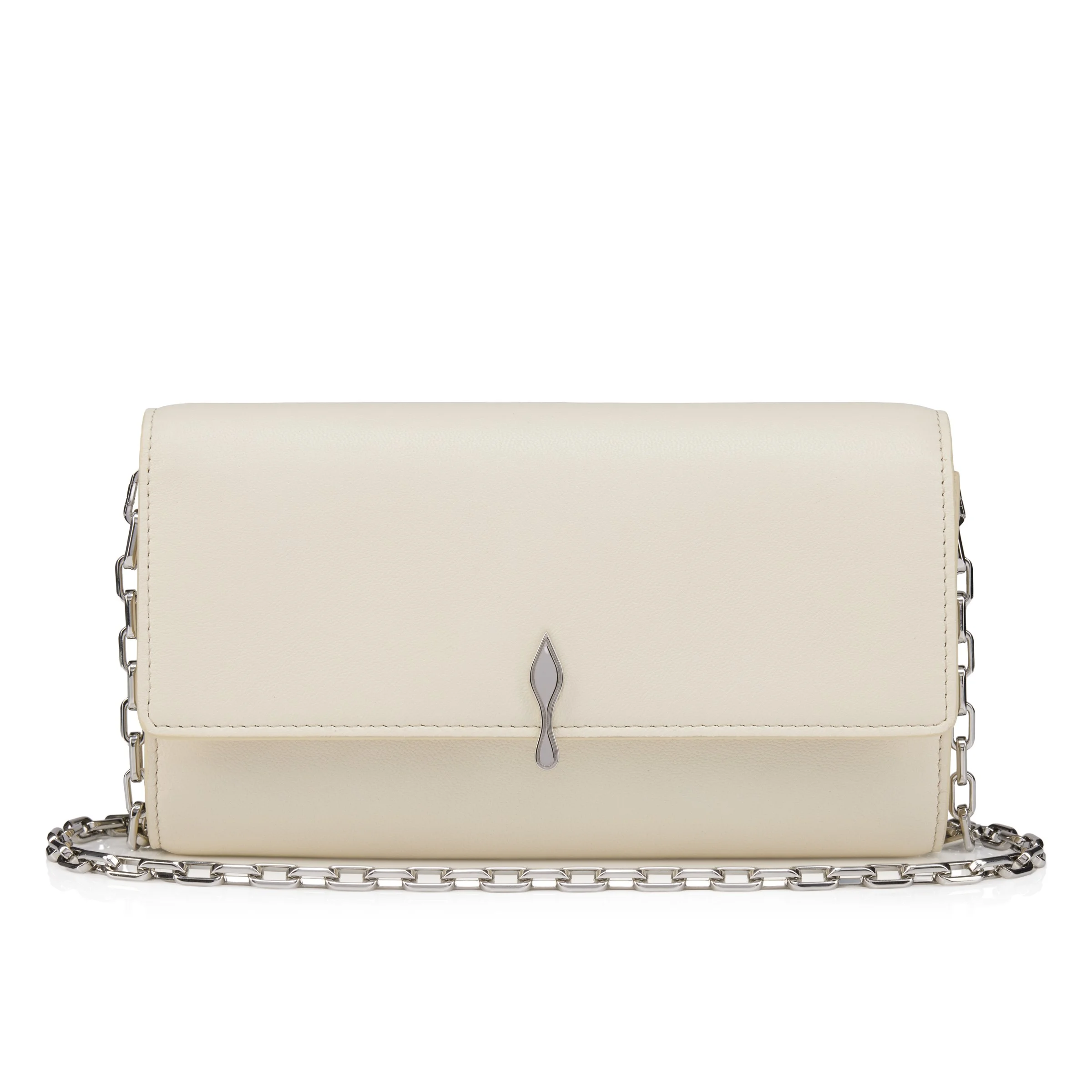 An iconic Maison Christian Louboutin model, the Bettina wallet on a chain boasts sophistication. Adorned on the front with a silver metal clasp evoking the silhouette of the iconic sole, this elegant model is made entirely from smooth Suzuran white lamb nappa leather. The nappa leather, with its semi mat aspect and slightly visible natural grain, exudes quality and offers a timeless and sophisticated look. - 1 x 41.7 inch / 106 cm removable metal chain for hand, crossbody, or shoulder carrying - Magnetic button fastening - 1 main compartment - 1 flat pocket - 3 card slots - Dimensions: - H 4.7 x L 7.5 x W 1.6 inches - H 12 x L 19 x W 4 cm Product information Reference: 1265040W707 Color: Suzuran Material: Lamb nappa leather Dimensions: 120mm x 190mm x 40mm