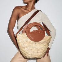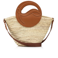 The Biloumoon Basket bag in size medium has an elegant summery style. The body of the bag is crafted from handwoven palm leaves, while the handle, a stunning new interpretation of the Maison Christian Louboutin's mooncrest logo, showcases Cuoio brown calf leather. - Detachable webbing strap allows it to be carried over-the-shoulder or by hand. - 2 handles - 1 main compartment - Security hook - Dimensions: - H 16.5 x L 18 x W 7 inches - H 42 x L 46 x W 18 cm - Strap dimensions: - L 88 x W 3.5 cm - L 34.5 x W 1 inches Product information Material: Raffia Color: Natural Reference: 32450126039 Collection: Fall Winter 24