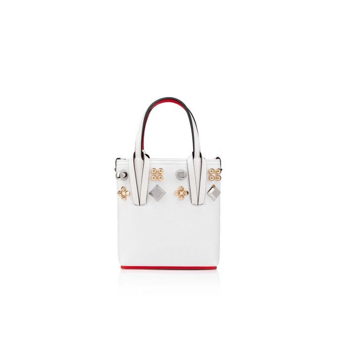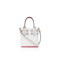 The Cabata N/S Mini is a reworked version of the Maison’ Christian Louboutin's classic Cabata tote bag. This sophisticated, yet edgy model features a technical, structured design. Details include flat handles looped through a contrasting smooth leather harness feature. This version comes in Bianco white grained calf leather highlighted with signature red. The leather join on the top of the bag is framed with iconic spikes Courones embellishments for an elegant punk twist. PRODUCT INFORMATION Reference: 1225053Q620 Color: BIANCO/MULTI Material: Calf leather Dimensions: 185mm x 160mm x 50mm Collection: Summer 22