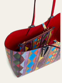 Crafted of calf leather, this Christian Louboutin "Cabata" tote bag is printed with a multicolor irregular diamond Losange design Detailed with signature spikes around the straps Flat shoulder straps Open top with internal strap closure Interior, removable ziptop pouch Signature red interior Approx. 9.4"H x 13.4"W x 5.5"D Made in Italy