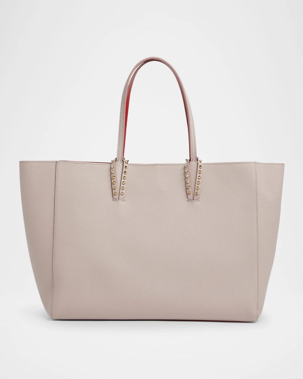 - Christian Louboutin "Cabata" soft tote bag in grained leather - Shoulder straps with spike trim - Open top with lobster clasp closure - Interior, leashed zip pouch bag - Signature red lining - Lining: Leather - Rubber logo bottom - Approx. 11.4"H x 15.4"W x 6.3"D - Made in Spain
