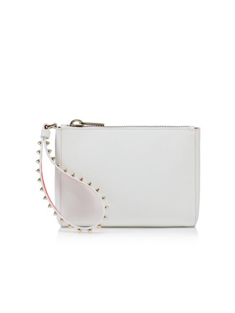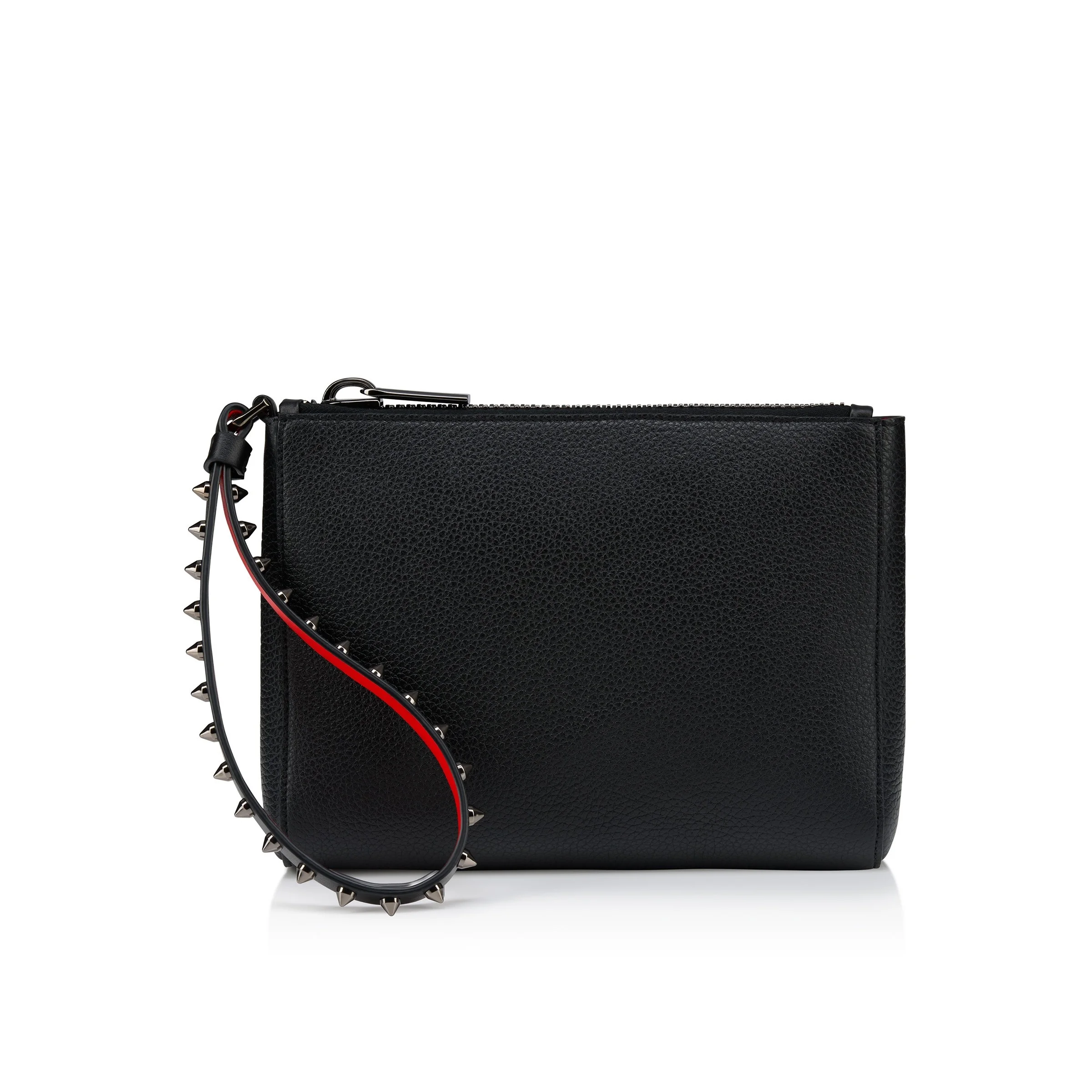 The Cabata pouch in size mini is designed to slip easily into the Maison Christian Louboutin Cabata Tote, or be carried on its own as a clutch. It features a slender wrist strap, adorned with signature gun metal spikes. This model is crafted in supple grained calf leather in black. - Zip fastening - Leather wrist strap - 1 main compartment - Dimensions: - H 5.5 x L 7.5 x W 1.8 inches - H 14 x L 19 x W 4.5 cm Product information Reference: 3255159B078 Color: Black Material: Soft calf leather Dimensions: 140mm x 190mm x 45mm