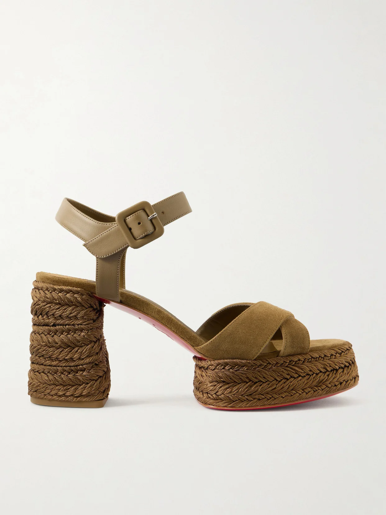 A fresh interpretation of the classic espadrille, the 'Calakala' sandals by Christian Louboutin showcase the house's signature craftsmanship. Suede cross-over straps frame the upper, while the platform rests on a braided jute sole. A buckled ankle strap secures the fit.