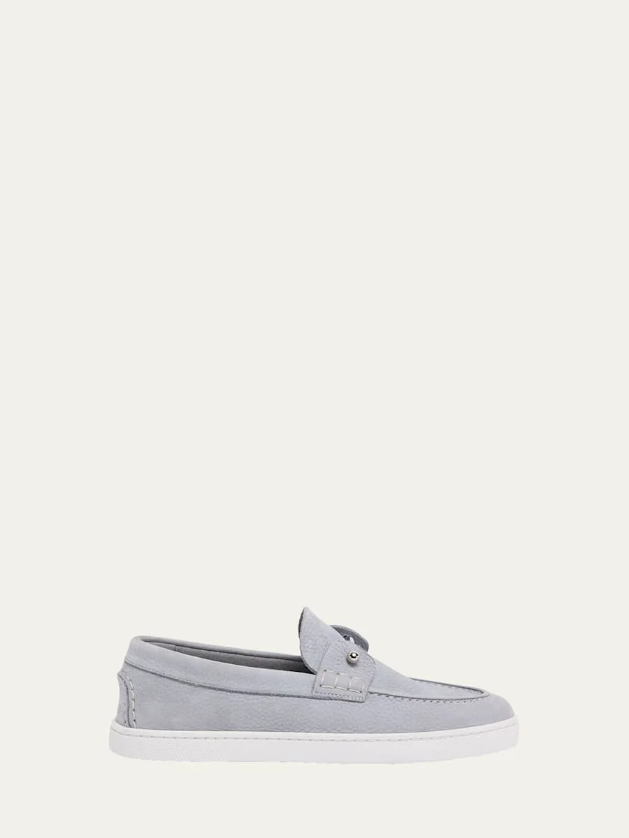 Crafted from calf leather, the "Chambeliboat Donna" boat shoes by Christian Louboutin are set on a contrasting rubber sole Flat heel Round moc toe Notched vamp with a silver collar pin Slipon style Made in Italy