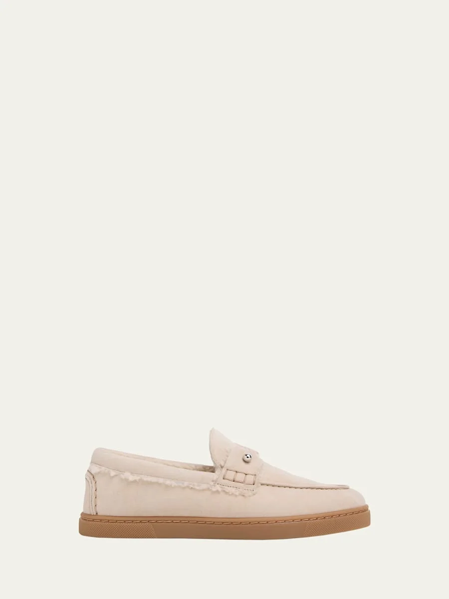 Updated for an ultracozy fit, the "Chambeliboat donna" boat shoes by Christian Louboutin are crafted from supple suede with bleached sheep shearling (Italy) for added comfort and warmth. Flat heel Almond moc toe Notched vamp with keeper strap Slipon style Signature Louboutin red leather outsole Lining: shearling Made in Italy