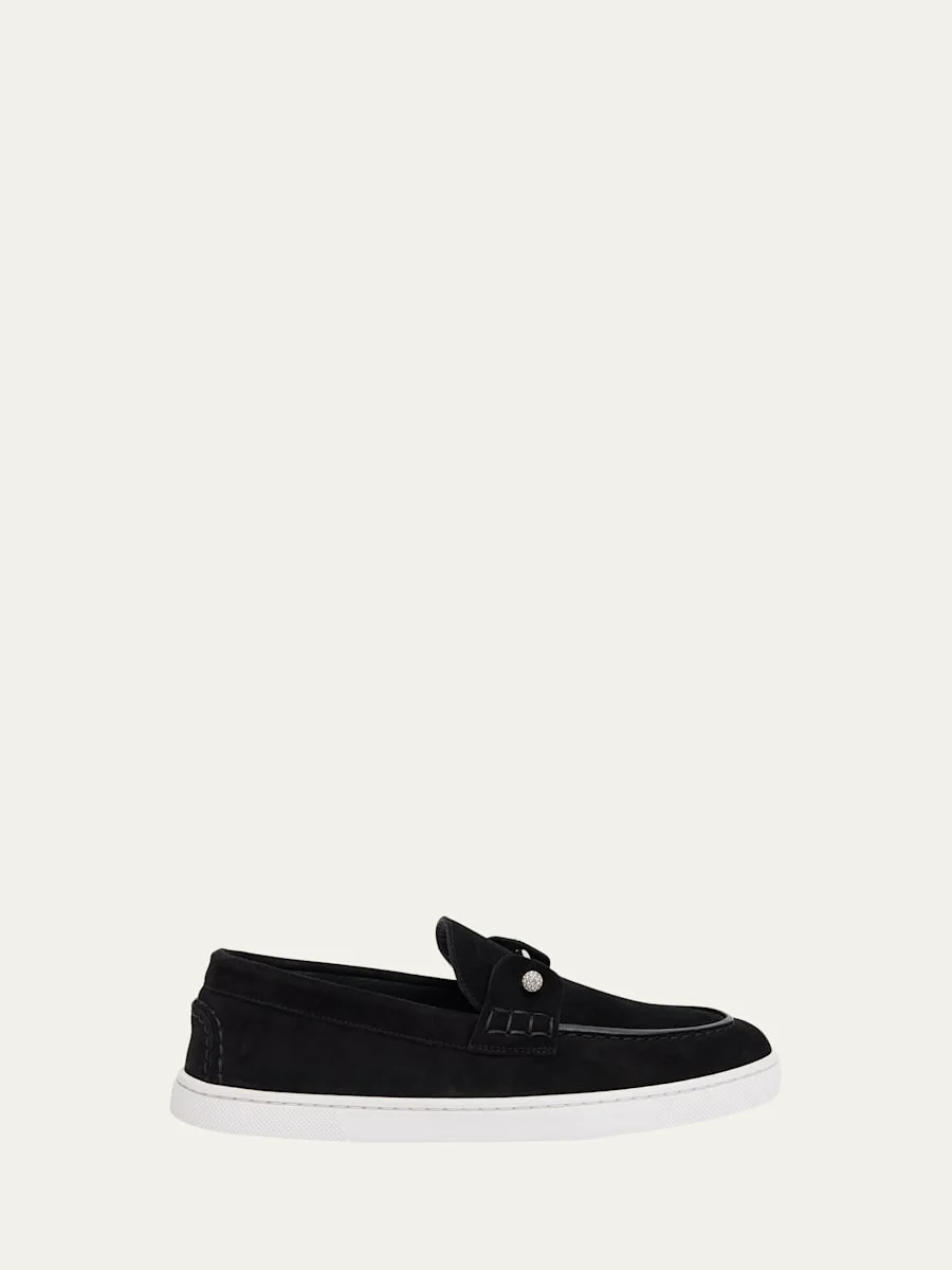 Christian Louboutin's "Chambeliboat Donna" boat shoes are supple suede Flat heel Round apron toe Notched vamp with crystalembellished metal collar pin Slipon style Rubber outsole Made in Italy