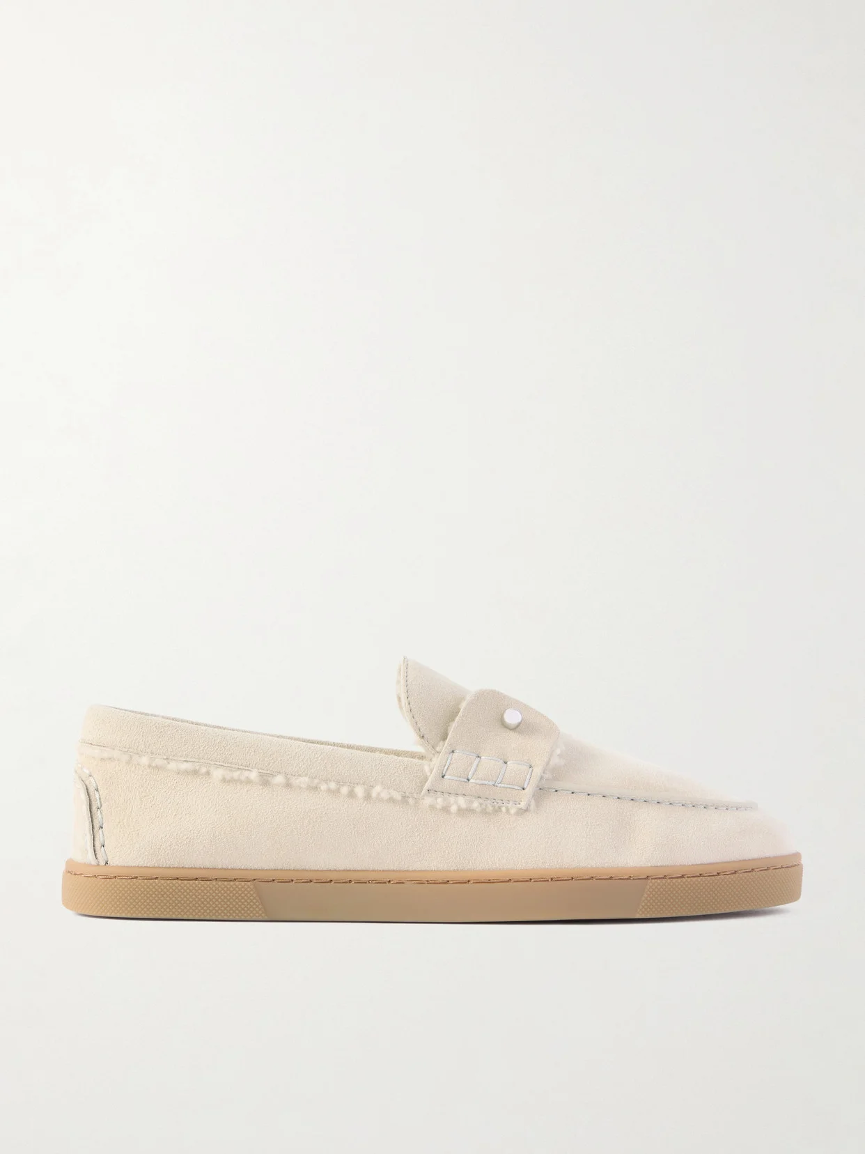 Christian Louboutin's 'Chambeliboat' loafers are given a cozy, seasonal update. They're made from suede with plush shearling inside and have a shiny metal barbell piercing the top. The rubber soles are lacquered in the iconic red.