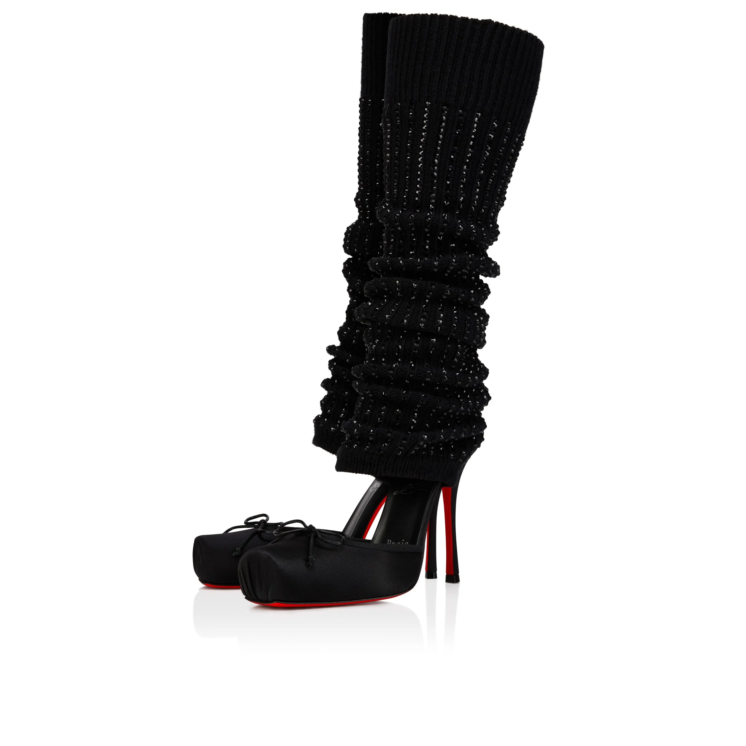 The strikingly elegant Cassia Annmac hybrid pump combines the Cassia look and a tonal knitted legwarmer-style sleeve adorned with tone-on-tone strass. This Maison Christian Louboutin shoe is crafted from black crepe satin with tonal black lining, and set on a 100 mm stiletto heel. Product information Reference: 1260130B439 Color: Black Material: Crepe satin and mesh Heel Height: 100 mm
