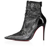 With its elegant lines, the Kate Max Booty Mesh Strass boot is a testament to the 'savoir-faire' of Christian Louboutin. Sophisticated, it features a pointed toe and side zip closure. Crafted entirely from patent calf leather and black fishnet embellished with square strass, this beautifully finished shoe sits on a 100 mm heel.This model features an 'Everlasting Red sole" thanks to an innovative coating technique to ensure resistance and lasting vibrancy for our signature Louboutin red. Product information Reference: 1250367B627 Color: Black Material: Mesh Heel Height: 100 mm