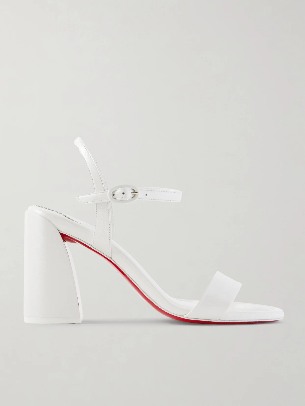 Christian Louboutin's 'Miss Jane' sandals have been made in Italy from white leather with a soft, pearlescent finish. They have slim, adjustable ankle straps, classic almond toes and sculptural heels that reveal glimpses of the signature red soles as you walk.
