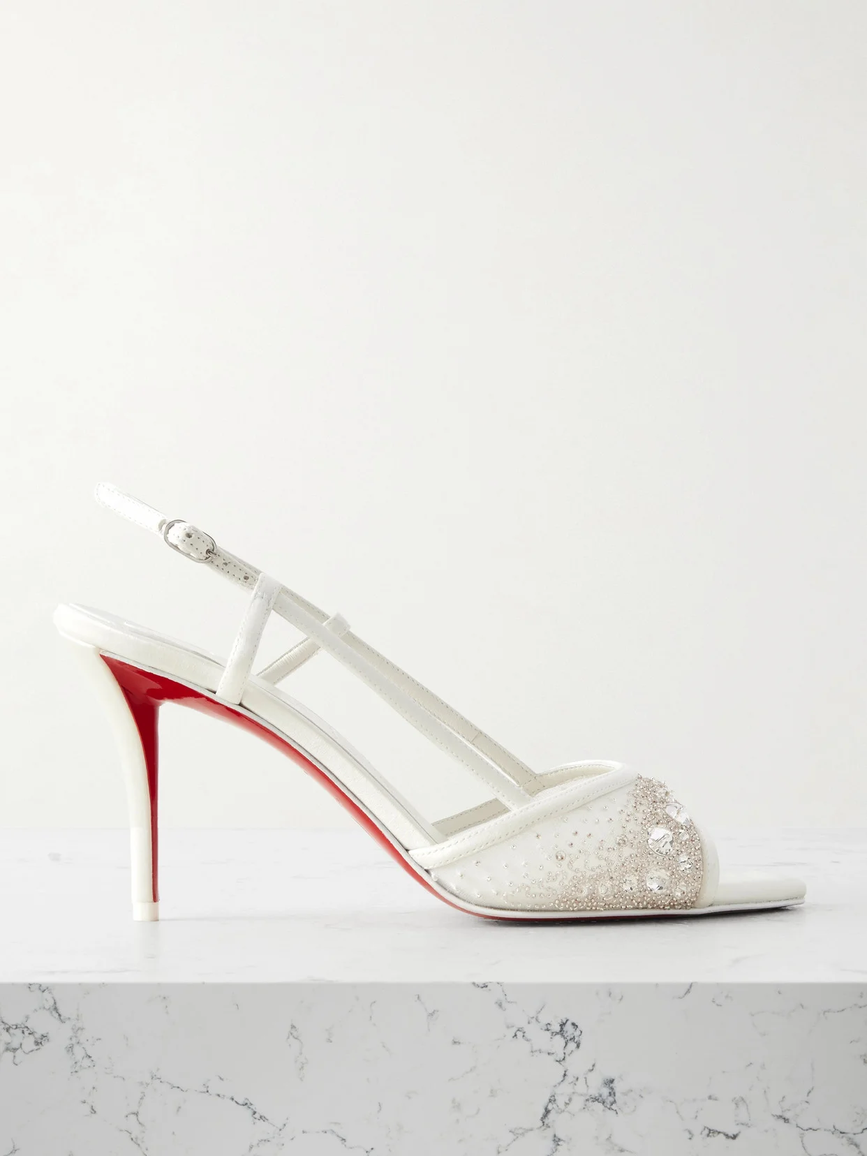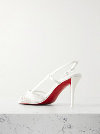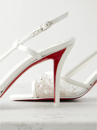 Christian Louboutin's 'Miss Z' sandals are intricately decorated with hand-placed crystals and beads that add plenty of glamour. Made from mesh and leather, they have slim slingback straps and signature 'Everlasting Red' lacquered soles visible at the stiletto heels.