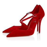 The tapered silhouette of the Miss Z pump ensures a sophisticated style. Set on a 100 mm stiletto heel that reveals the iconic Loubi red sole, this Maison Christian Louboutin model is crafted from Fever red veau velours. This shoe has an elegant decollete trimmed with an asymmetrical strap, and also features a padded insole. This model features a new 'Everlasting Red' sole thanks to an innovative coating technique that ensures resistance and lasting vibrancy for our signature Louboutin red. Product information Reference: 3250637R667 Color: Fever Material: Veau velours Heel Height: 100 mm