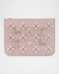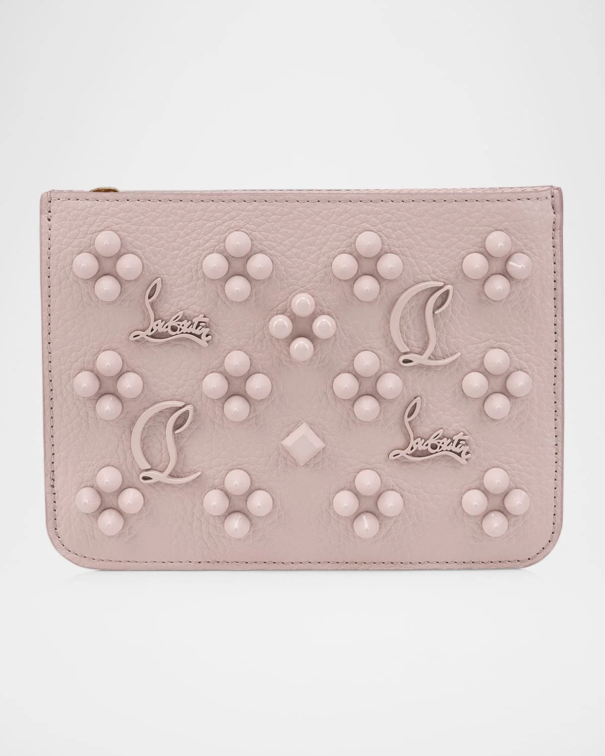 - Christian Louboutin "Paloma" leather card holder with signature Loubinthesky studs - Zip top closure - Exterior, one slip pocket and four card slots - Interior, chain leash strap - Signature red lining - Lining: Cotton - Approx. 3.5"H x 5.1"W - Made in Italy