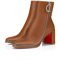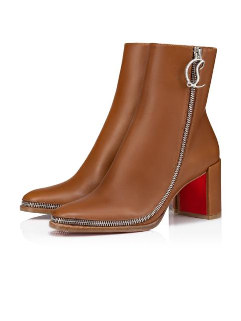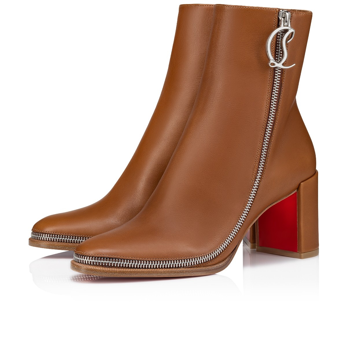The CL ZIP ankle boot showcases sleek lines. This model is set on a 70 mm heel and is crafted in Cuoio brown calf leather. It features a silver zip joining the top of the upper to its curved toe. This model owes its names to Maison Christian Louboutin's CL monogram which appears on the zip fastening. Product information Material: Calf leather Color: Brown Reference: 3230764BG71 Heel height: 70 mm Collection: Summer 24