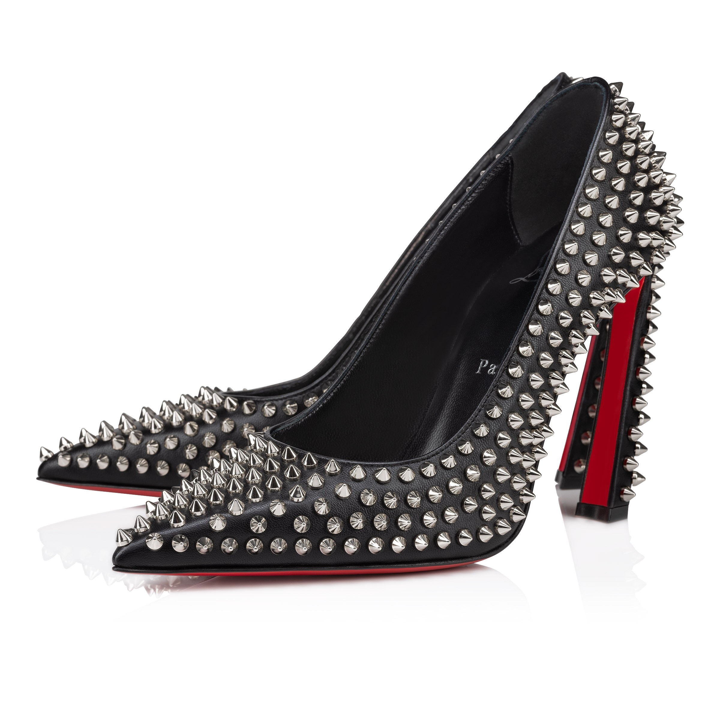 The Condora Spikes pump has a pointed toe like a bird's beak. This sophisticated style in black nappa leather has a daring low-cut vamp revealing the foot. It has an 85 mm slanted heel and signature metal spikes showcasing Maison Christian Louboutin's innovative creativity. Product information Reference: 3240278B439 Color: Black Material: Nappa leather Heel Height: 100 mm Collection: Fall Winter 24
