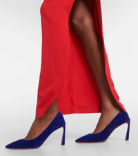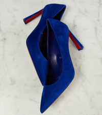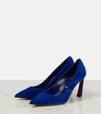 Christian Louboutin's Condora pumps radiate timeless elegance. Expertly crafted from blue suede, this pair features signature red-lacquered soles and 85mm flared heels for sculptural touch. Product Details - Upper: calf leather - Lining: leather - Sole: leather insole and sole - Toe shape: pointed toe - Made in Italy - Comes with a box - Comes with dust bags - Item number: P00827874 Size & Fit - Fits slightly large to size - we recommend trying a half size smaller - Narrow at the toe - European sizes - 9cm-3.5" heel (size EU 38)