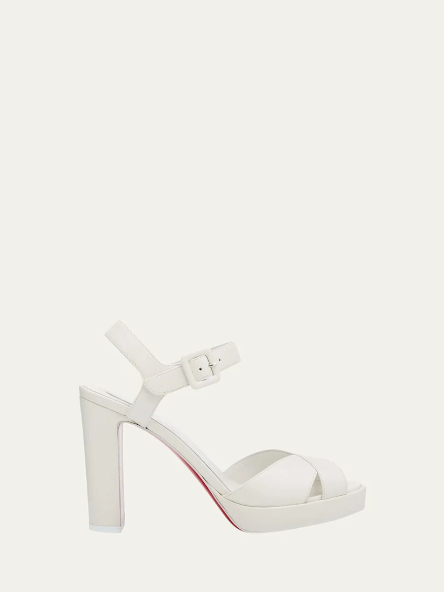 Crafted of lamb nappa leather, the "Cora" sandal by Christian Louboutin is effortlessly elegant for daytoevening wear. 4.00 in / 100 mm block heel; 0.6 in / 15 mm platform Open toe with crossover straps Adjustable ankle strap Signature Louboutin red leather outsole Made in Italy