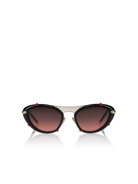 Dolly LB0002 is one of the most iconic styles of this sunglasses collection. It features a cat-eye shape with palmette pattern crafted metal on the frontal grabbed by tiny red sole signifier and art deco inspired metal temples with palm detail on the hinge. This model is made in a pale gold color with smoke red mirrored lenses. High-performance Zeiss lenses offering exceptional quality comfort and durability in an exclusive color made only for Christian Louboutin collection. Cat-eye shape with airy, perforated metal palmette pattern on the frontal grabbed by tiny red sole signifier. The design draws inspiration from the shapes of Art Deco, reflected in the uniquely pointed bridge and in the palmette pattern of the front and palm detail on the hinge. The frame is a tribute to lightness, embodying a new level of femininity and grace. Each curve and contour reflects an elegance that is subtle yet powerful, capturing the essence of refined beauty. This design harmoniously blends artistic sophistication with a gentle, airy presence, offering a timeless elegance that resonates with those who appreciate the finer things in life. These frames are suitable to add prescription lenses. Made in Italy. Product information Reference: 1255336K195 Color: Gold Material: Metal Lens width: 54 mm Bridge length: 19 mm Temple length: 135 mm Category of filtration: 3