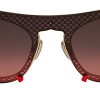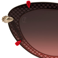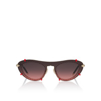 The Dolly LB0007 sunglasses feature an oval-shaped design that blends boldness and sophistication. This elegant metal version features an elaborately designed front, in which the full wraparound lens is embedded in the metal frame reproducing the brand's iconic palmette pattern. The red inserts at the corners add a signature touch recalling the iconic Christian Louboutin red soles. This model is made in a pale gold color with smoke gradient red lenses. High-performance Zeiss lenses offering exceptional quality comfort and durability in an exclusive color made only for Christian Louboutin collection. Made in Italy. Product information Reference: 1255349K194 Color: Gold Smoke Material: Metal Temple length: 135 mm Category of filtration: 3