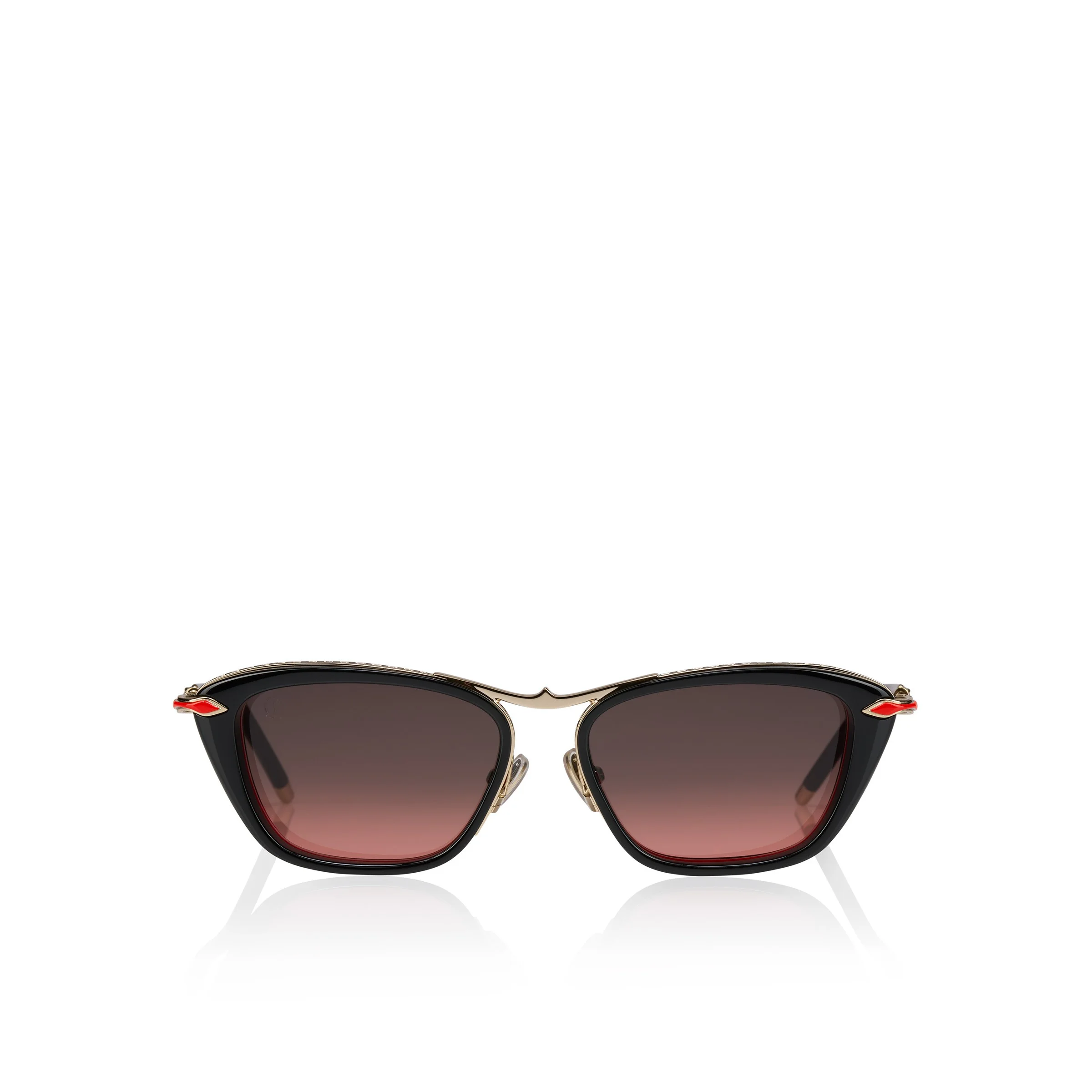The Dolly LB0022 sunglasses from Eyewear Collection 2 are inspired by the iconic Christian Louboutin Dolly Pump and a touch of Art Deco. The frames are a tribute to lightness, embodying a new level of femininity and grace. This combo style features a geometric shape. The crafted pale gold metal lens profile with a palmette pattern is combined with bilayer black and transparent red base acetate and high-performance Zeiss red smoke mirrored lenses that offer exceptional quality, comfort, and durability in an exclusive color made only for the Christian Louboutin collection. Dimensions: - Lens width: 54mm - Bridge: 16mm - Temple length: 140mm These frames are suitable to add prescription lenses. Made in Italy. Product information Reference: 1265186K197 Color: Black smoke Material: Metal Lens width: 54 mm Bridge length: 16 mm Temple length: 140 mm Category of filtration: 3