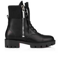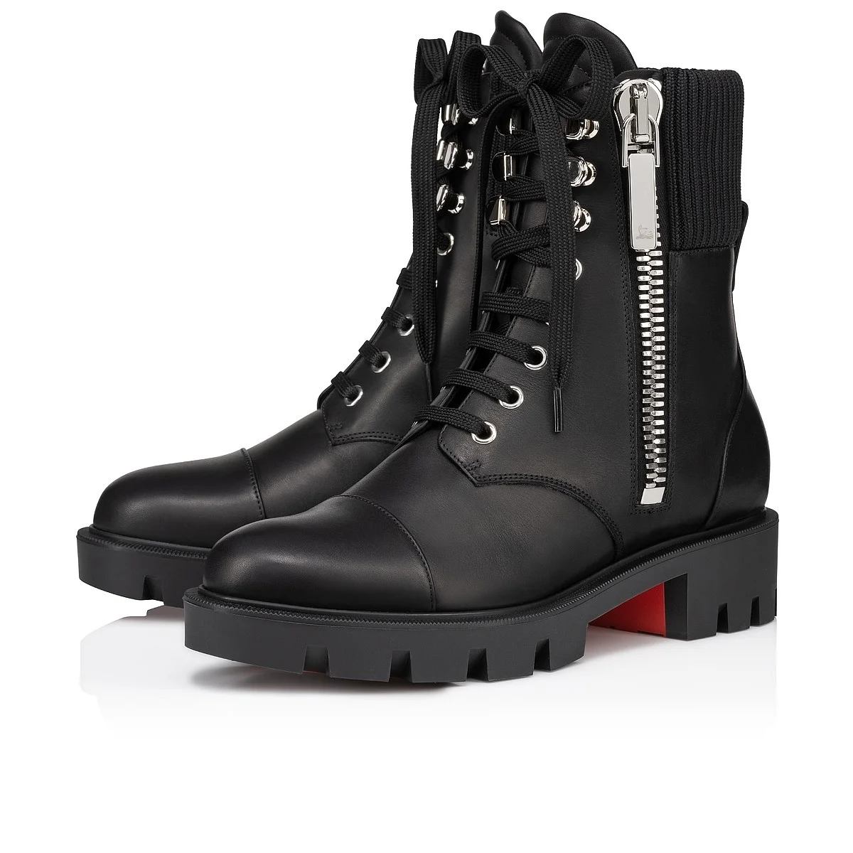 Taking its inspiration from biker boots, the En Hiver Lug ankle boot showcases a modern look. This Maison Christian Louboutin model sits on a lug sole and is crafted in black patent calf leather. The lacing on the front is complemented by an over-sized silver side zip. Product information Material: Calf leather Color: Black Reference: 1240236BK01 Collection: Summer 24