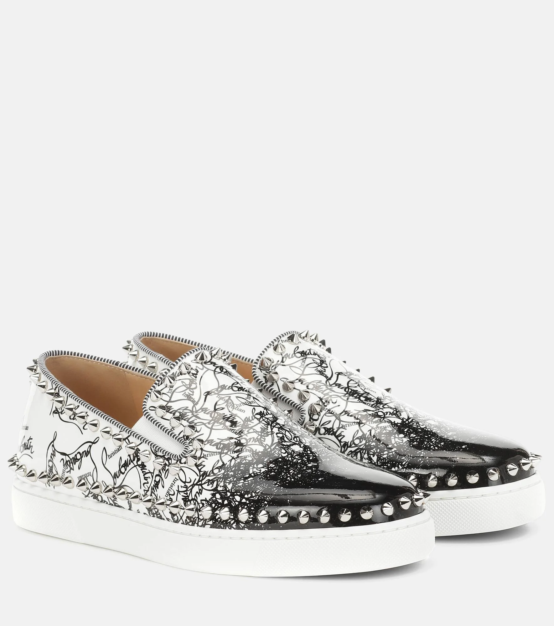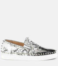 A quintessential slip-on style, the Pik Boat Woman sneakers from Christian Louboutin have been updated in a graffiti illustration of the label's signature logo as an exclusive to Mytheresa. The design has been crafted in Italy from Degraloubi patent leather that's punctuated by studs. Let their monochromatic colorway be the street-savvy base to an array of new season looks. - upper: leather - lining: leather - trim: platinum-plated studs - sole: leather insole, rubber sole - round toe - elasticated sides - Made in Italy - exclusive to mytheresa.com - Designer colour name: Black Snow