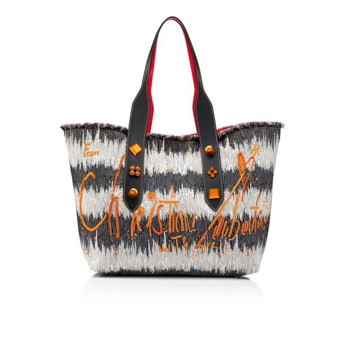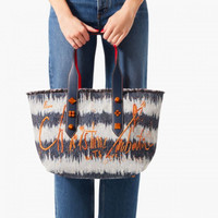 The modern Frangibus medium bag stands out on account of its graphic lines. This blue denim and embroidered fabric version bears the Maison Christian Louboutin signature. Its two navy blue calfskin handles are embellished with orange spikes, for a bold style. This bag can be carried by hand or worn over the shoulder.- 1 pocket with magnetic button- 2 handles- dimensions: 280 x 380 x 200 mm PRODUCT INFORMATION Reference: 1225297U864 Color: DENIM-ORANGE/NAVY/SABAGOLD Material: Fabric Dimensions: 280mm x 380mm x 200mm Collection: Summer 22