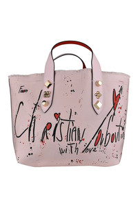 Christian Louboutin Frangibus small tote bag in pink fabric. Two leather handles adorned with 3 gold studs. Top edge highlighted by bangs. Black and red paint stain effect on front. Writing: “From Christian Louboutin with love”. Small internal leather pocket. Removable shoulder strap. Dimensions: 22 cm x 27 cm x 14 cm. Made in Italy.