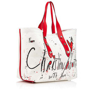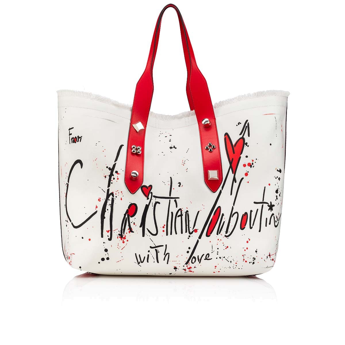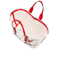 For a casual, streetwear look and iconic Maison Christian Louboutin details look no further than the Frangibus a practical canvas tote with leather handles embellished with signature spikes. This smaller model is perfect for every day and features a message from Christian on the front. A color palette of Ivory, Black, Loubi and Silver highlight the classic roots of this model.