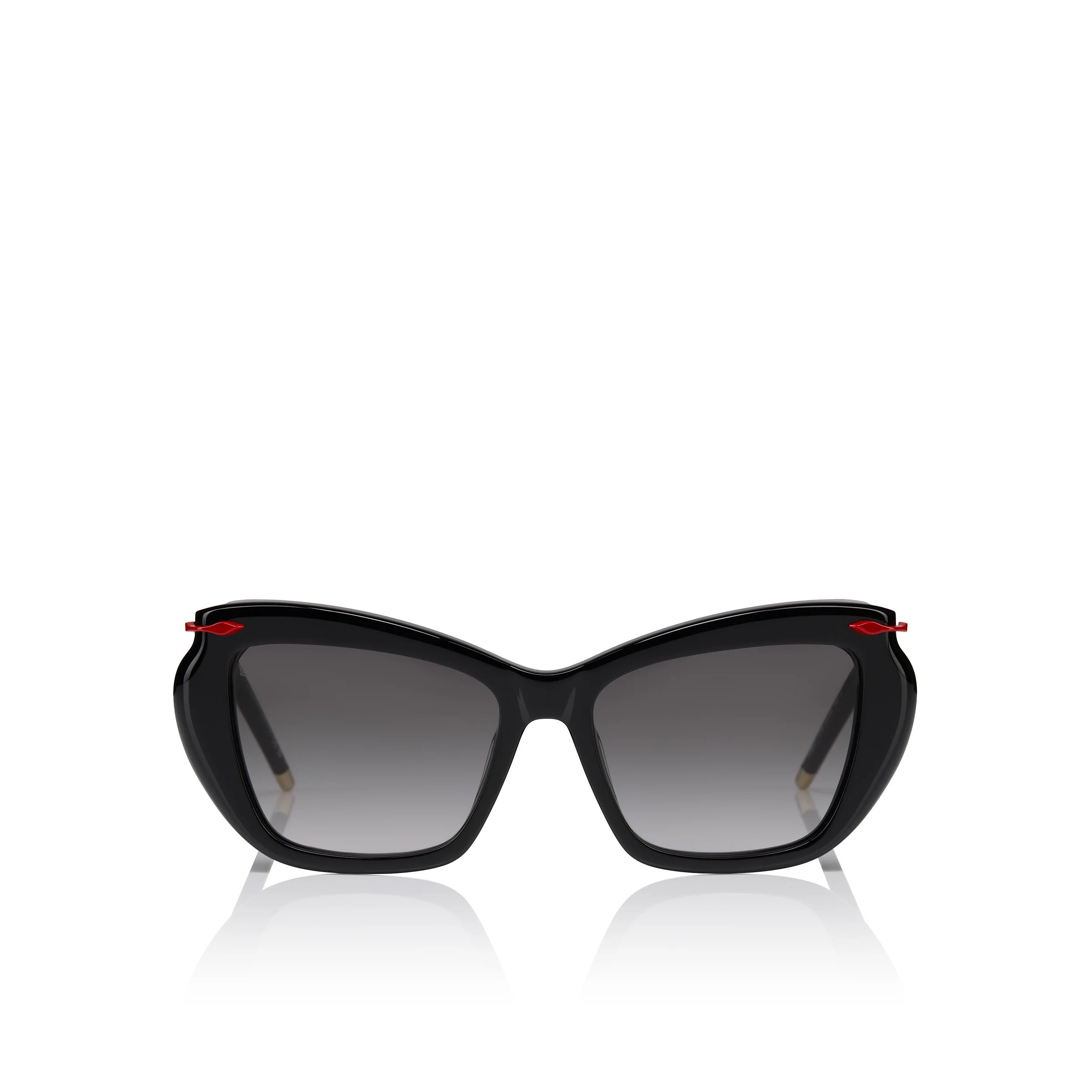 The Hot Chick LB0011 sunglasses feature a modern cat-eye design. The acetate frame exudes elegance, drawing inspiration from Christian Louboutin's Hot chick decollete. The new sophisticated construction of the front is perfectly aligned with the refined detailing on the temples, where red and gold accents pay tribute to the brand's iconic style. This model is made in a black color with gradient smoke lenses. High-performance Zeiss lenses offering exceptional quality comfort and durability for Christian Louboutin collection. These frames are suitable to add prescription lenses. Made in Italy. Product information Reference: 1255352K199 Color: Shiny Black Material: Acetate Lens width: 53 mm Bridge length: 16 mm Temple length: 140 mm Category of filtration: 2