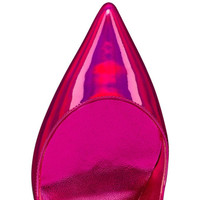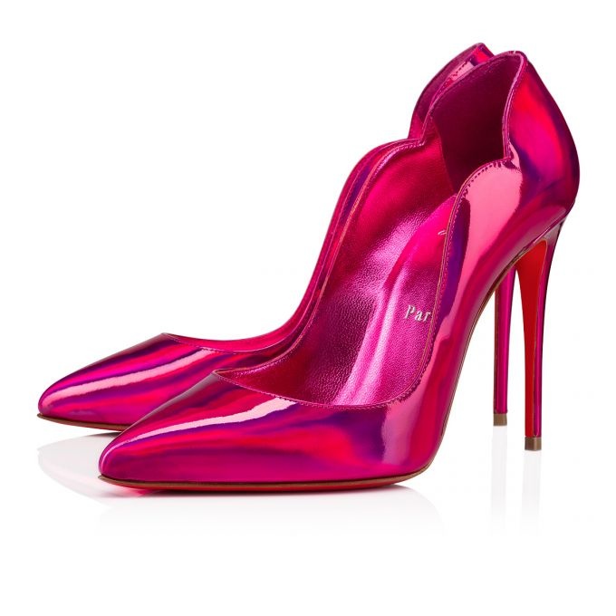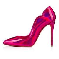 The Hot Chick pump is an iconic Maison Christian Louboutin design with a low-cut vamp enhanced by a pointed toe and V-shaped notches under the ankle. Set on a 100 mm stiletto heel, it is entirely crafted in patent Psychic leather with metallic hues. Its Fuxia pink color is both elegant and creative. PRODUCT INFORMATION Reference: 3210007P708 Color: Pink Material: Patent calf Heel Height: 100 mm Collection: Fall Winter 21