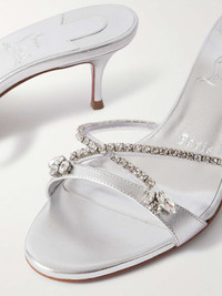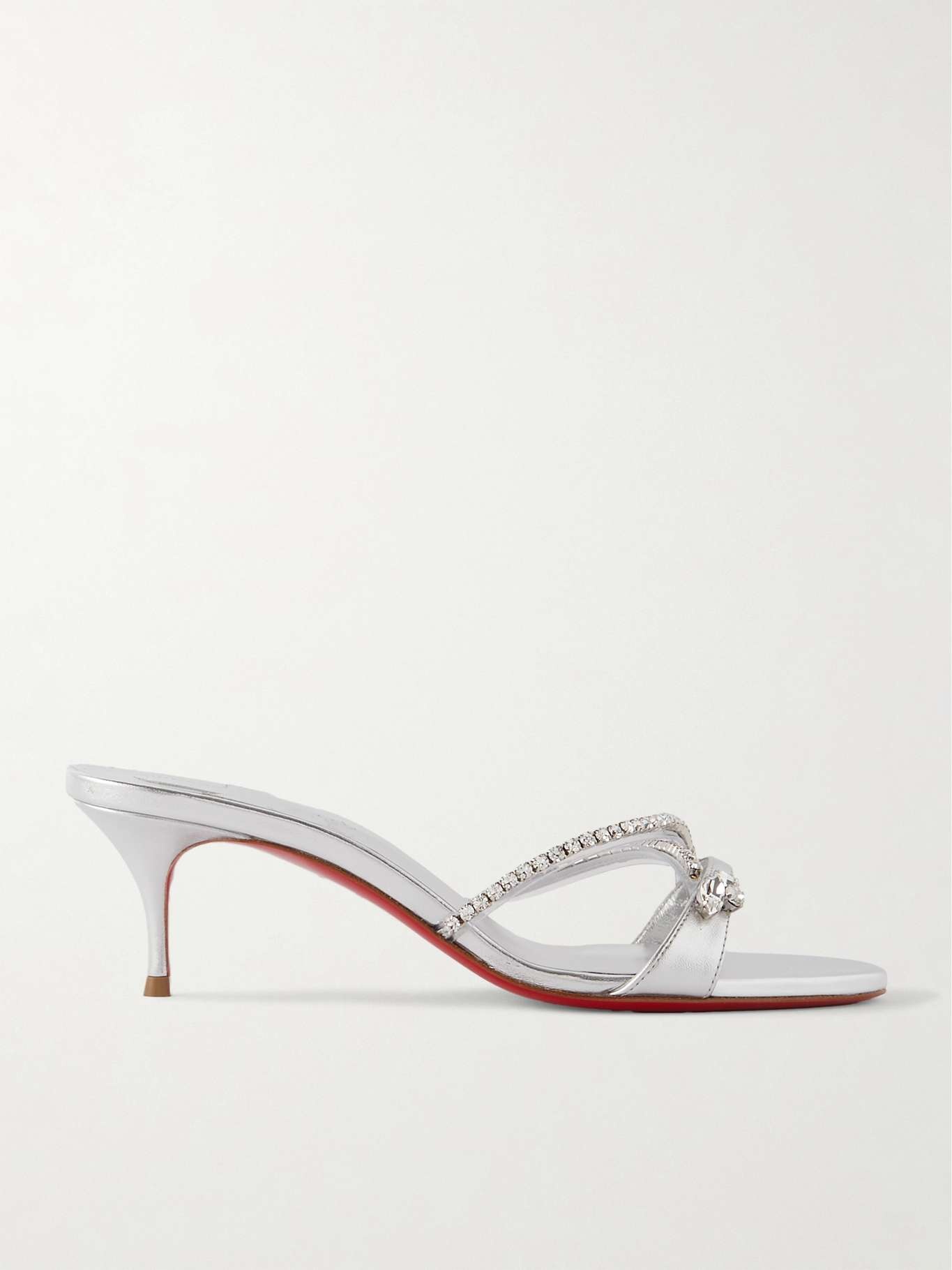 EDITORS'NOTES Christian Louboutin's 'Iza Queen' mules are perfect for making an entrance. Set on 55mm kitten heels and crafted from leather, the straps are traced with majestic crystals. The flash of red at the lacquered soles contrasts the silver beautifully. SIZE & FIT - Fits true to size, take your normal size - Italian sizing DETAILS & CARE - Heel measures approximately 55mm/ 2 inches - Silver metallic leather (Calf) - Slip on