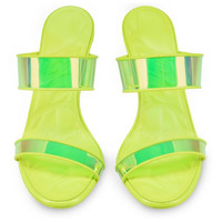 The Just Loubi sandal features contemporary lines, showcasing Maison Christian Louboutin's expertise. This fluo yellow model is set on an 85 mm heel and crafted in patent pearled leather and PVC. Its sleek style gently reveals the foot beneath. Product information Material: TPU Color: Yellow Reference: 1231056Y324 Heel height: 85 mm Collection: Summer 23