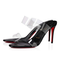 The Just Nothing is a mule sandal that has become a timeless Louboutin classic. “Just Nothing” except for an 85 mm heel and a red sole, this sandal creates a magical barefoot illusion thanks to the transparent PVC upper. This version comes in a luxuriously glossy patent leather, complemented with a comfortable liner. A versatile model that’s perfect for red-carpet-ready looks, chic lunches or poolside glamour.