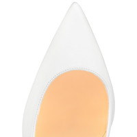 The Maison Christian Louboutin iconic Kate pump features sophisticated lines. It is set on an 85 mm heel and its sleek upper features a pointed toe and signature low cut that boldly emphasises the foot. This shoe is crafted entirely in white nappa leather and is enhanced by delicate finishes for a timeless elegance. Product information Material: Nappa leather Color: White Reference: 3190044W222 Heel height: 85 mm Collection: Fall Winter 20