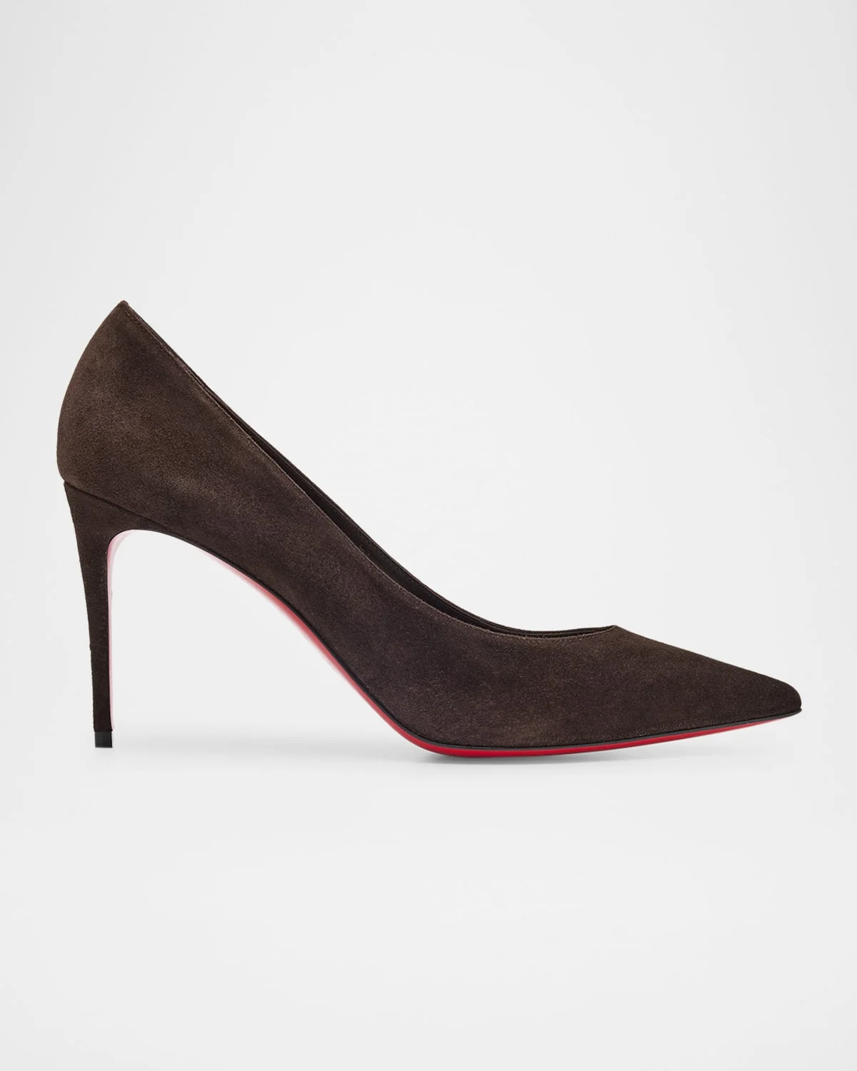 - Christian Louboutin "Kate" classic suede pumps - 3.25 in / 85 mm stiletto heel - Pointed toe - Slip-on style - Leather outsole - Made in Italy