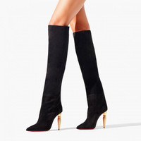 The Lipbotta knee-high boot showcases clean lines and timeless elegance. Crafted in black veau velours, it features a pointed toe and intricate details. This graphic style has a 100 mm gold heel. A captivating design evoking Maison Christian Louboutin's iconic red lipstick inspired by Egyptian columns. PRODUCT INFORMATION Reference: 1230336CM6S Color: Black Material: Veau velours Heel Height: 100 mm Collection: Summer 23