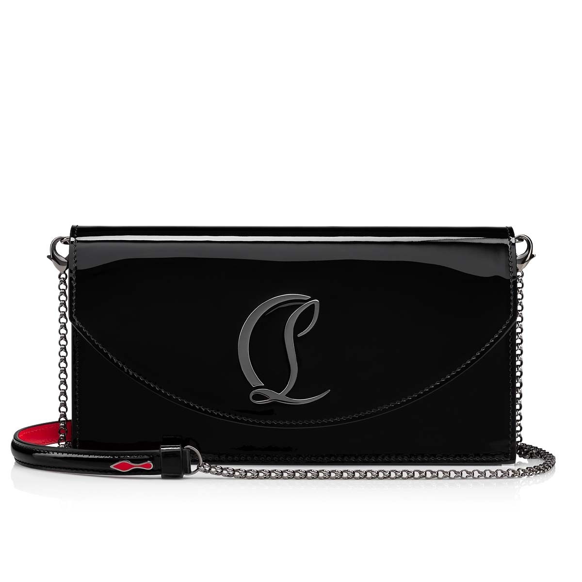 The Loubi54 bag with sophisticated lines features the iconic silver CL monogram of Maison Christian Louboutin. It is made entirely of patent, underlined by the delicacy of its finishes. - Interior flat pocket and card compartment - Magnetic closure - Detachable chain strap with leather reinforcement for adjustable carrying on the shoulder or across the body Product information Material: Calf leather Color: Black Reference: 3215268B078 Dimensions: 4.7 x 8.7 x 2.2 inches Collection: Summer 22