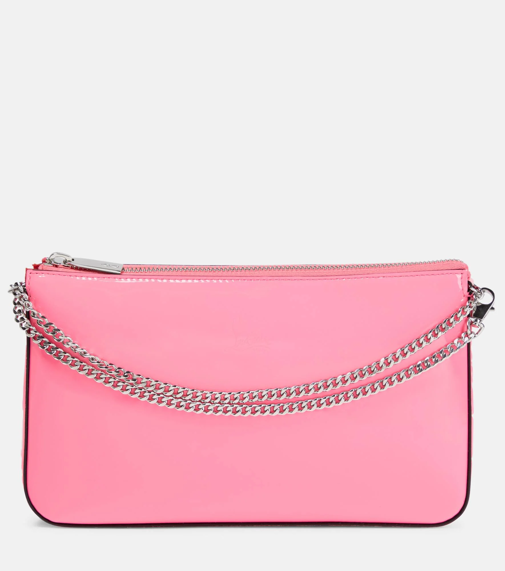 Embellished with studded flower appliqués, the Loubila clutch from Christian Louboutin combines tenderness and edge. It's made from black patent leather, lined in the maison's signature red, and has a double chain strap. - material: calf leather - internal details: fabric lining - detachable chain shoulder strap - zipped top - Made in Italy - comes with dust bag - Designer colour name: Poupidou/Poupidou size & fit - Height 14cm-5.5" - Width 24cm-9.5" - Depth 4cm-1.5" - Chain length 61cm-24"