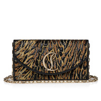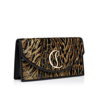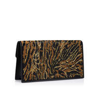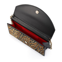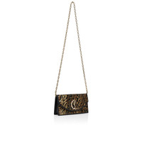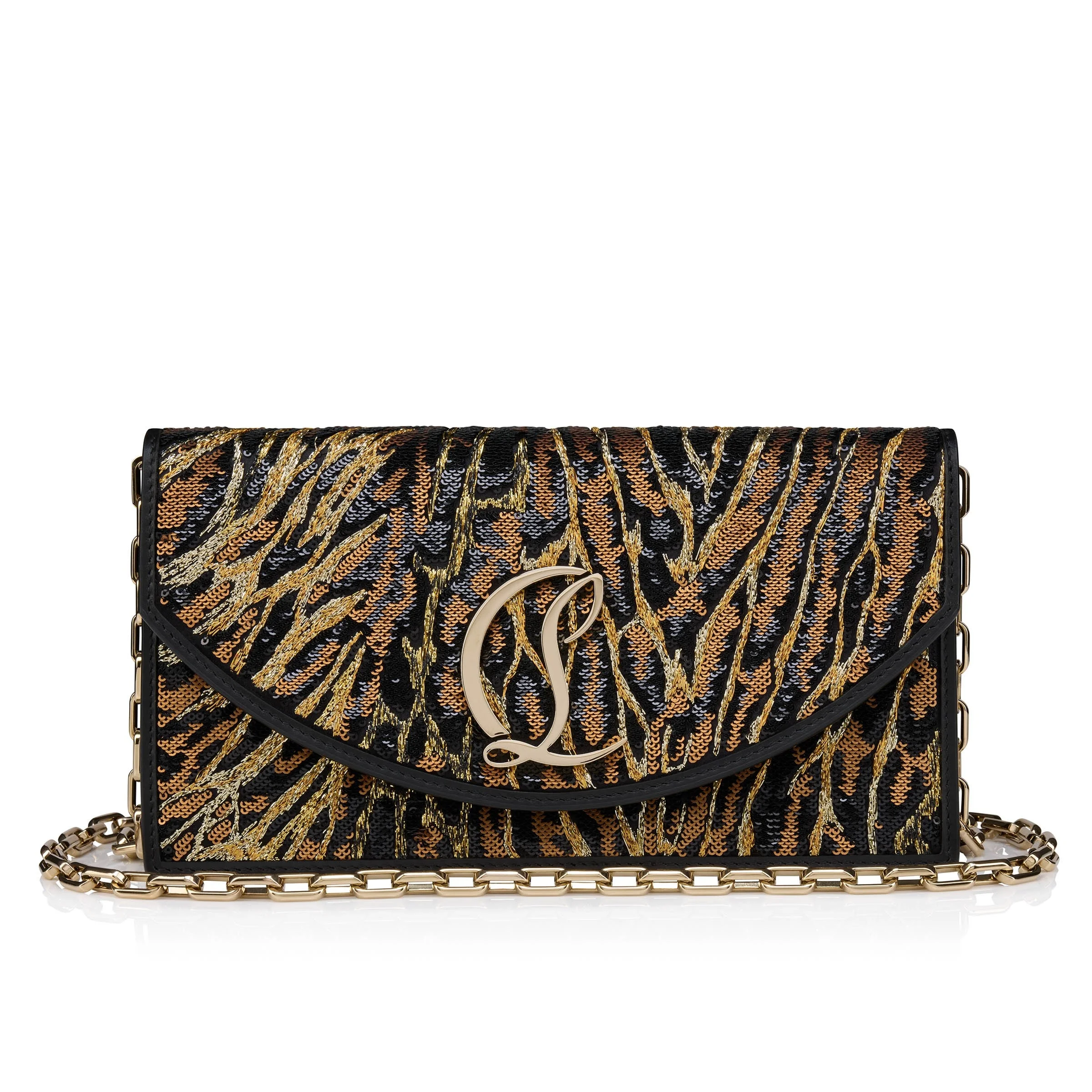An iconic Maison Christian Louboutin design, the Loubi54 clutch features sleek lines. Embellished on the front with a gold CL monogram, this elegant model is made entirely from black crepe satin adorned with embroidery and sequins in an Ocelot animal motif. - A removable 45 in leather-reinforced chain strap allows it to be carried by hand, over the shoulder or crossbody - Compartment with magnetic clasp closure - 1 interior pocket - 3 credit card slots - Dimensions: H 4.5 x L 8.5 x W 2 in Product information Reference: 1255264J169 Color: Black Material: Embroidered crepe satin Dimensions: 120mm x 220mm x 55mm