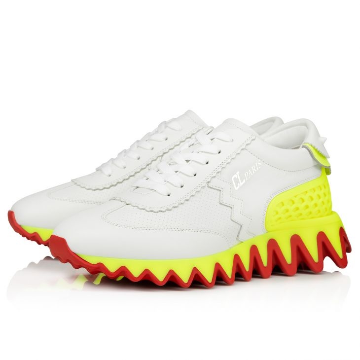 The Loubishark sneaker combines several textures to reveal the full extent of Maison Christian Louboutin savoir faire. This daring model sits on a two-tone rubber sole reminiscent of shark teeth. It is dressed in smooth and perforated white calf leather. The fluo yellow rubber cage-like panel at the back is adorned with signature white spikes. A silver CL monogram embellishes the side. Product information Material: Calf leather Color: Yellow Reference: 12309495015 Collection: Summer 23