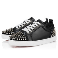 The Louise Junior Spikes low-top sneaker is inspired by the world of basketball and is set on a rubber sole. Blending elegant and sporty lines, this iconic model is entirely crafted from black nappa leather. Enhanced with delicate finishing touches, it features signature Maison Christian Louboutin metal spikes on the back and tip. Product information Reference: 1250302B601 Color: Black Material: Lambskin