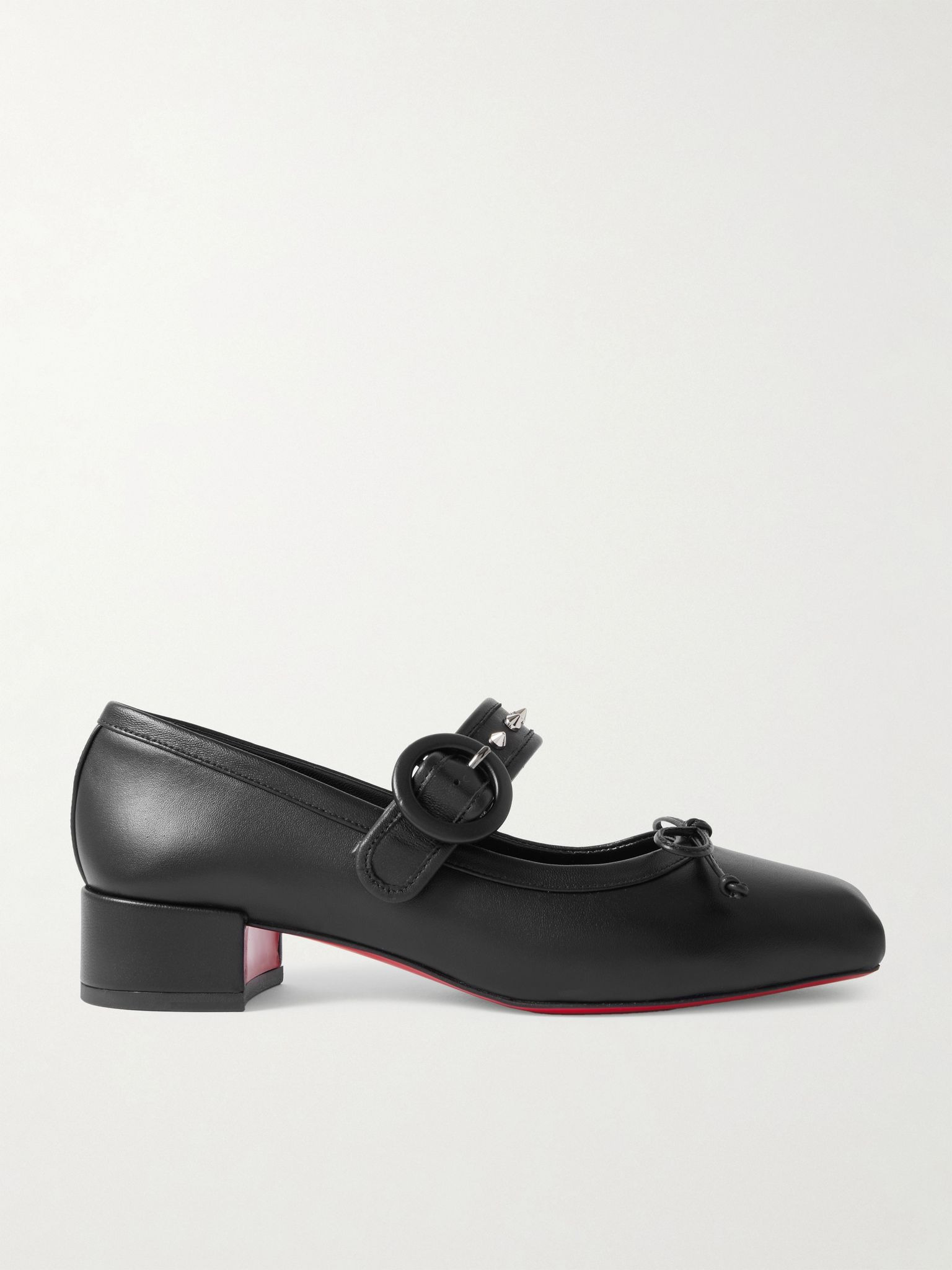 Christian Louboutin 'Mamastrapita' pumps bring a punky edge to the classic Mary Jane style. Crafted from buttery leather, they have wide straps highlighted with glimmering spikes and are detailed with a sweet bow atop the square toes. They look great with both bare legs and sheer hosiery. Details & Care - Heel measures approximately 30mm/ 1 inch - Black leather (Calf) - Buckle-fastening strap - Comes with dust bag