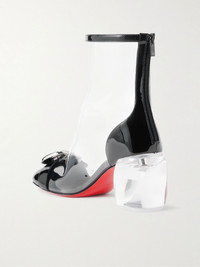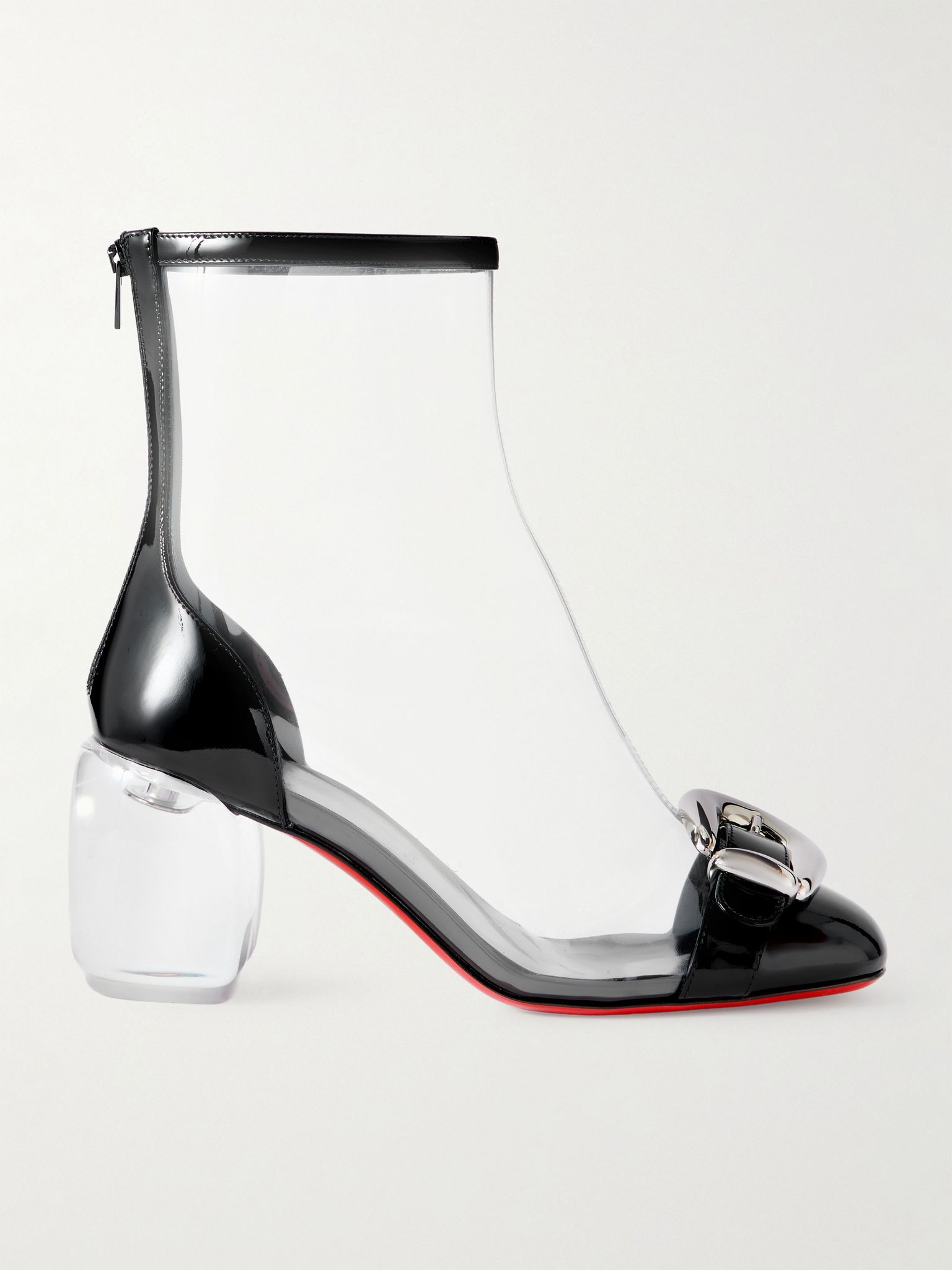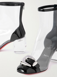 Christian Louboutin's 'Minny' ankle boots are equally innovative and playful in design. Made from a combination of clear PVC and black patent-leather, they rest on aptly named 'Bubble' heels and feature sizable silver-tone buckles at the rounded toes. Keep yours in focus by styling with cropped pants or midi skirts. Size & Fit - Fits true to size, take your normal size - Italian sizing Details & Care - Heel measures approximately 70mm/ 3 inches - Black patent-leather, clear PVC - Zip fastening