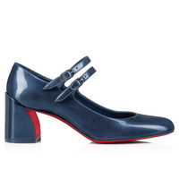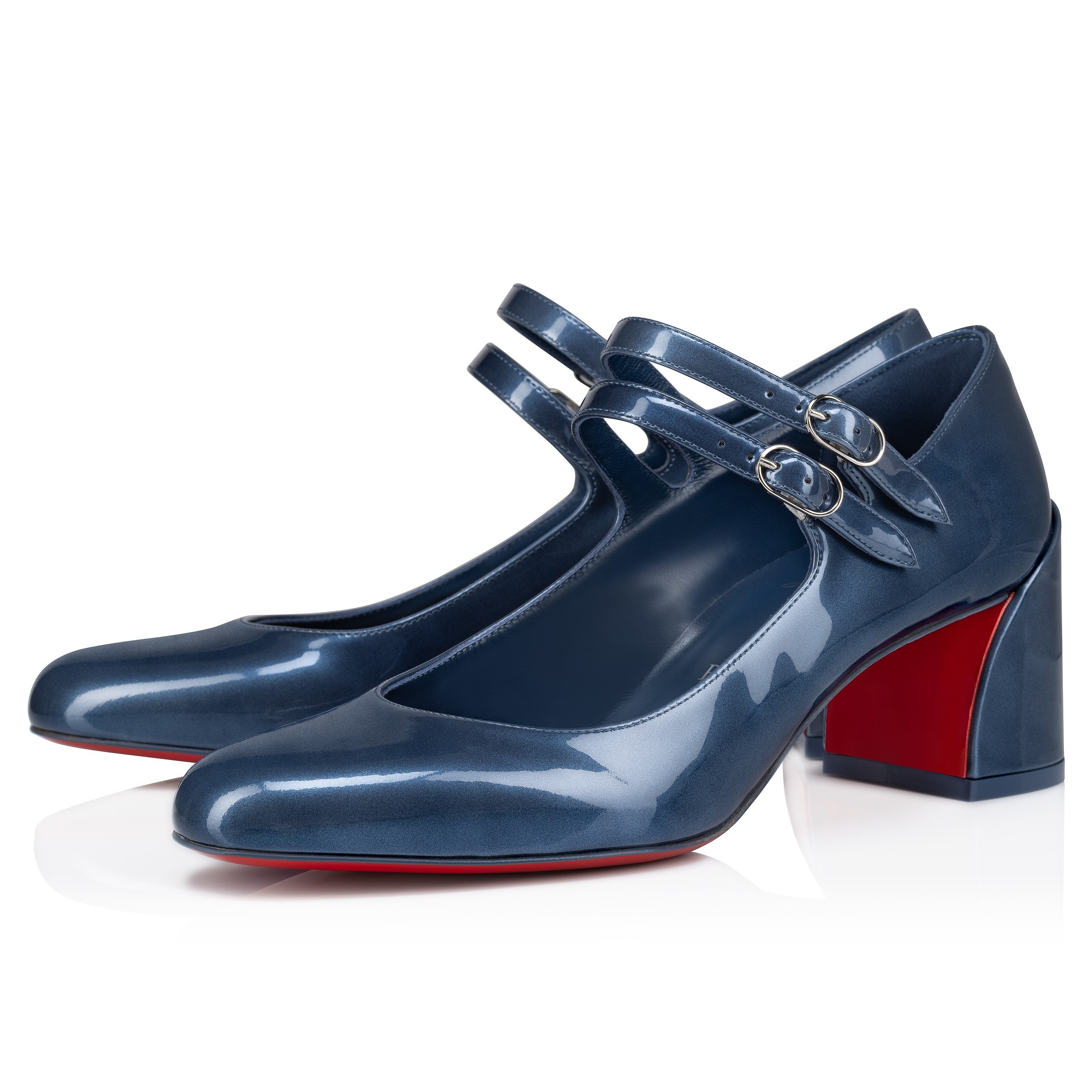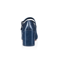The Miss Jane pump features a square, angled 55 mm heel. Crafted in denim-blue pearly patent calf leather, it has a rounded toe and Maison Christian Louboutin's signature daring low-cut vamp. Two slender straps with a metallic clasps delicately adorn the foot. Product information Reference: 32405604220 Color: Denim Material: Patent leather Heel Height: 55 mm Collection: Fall Winter 24