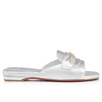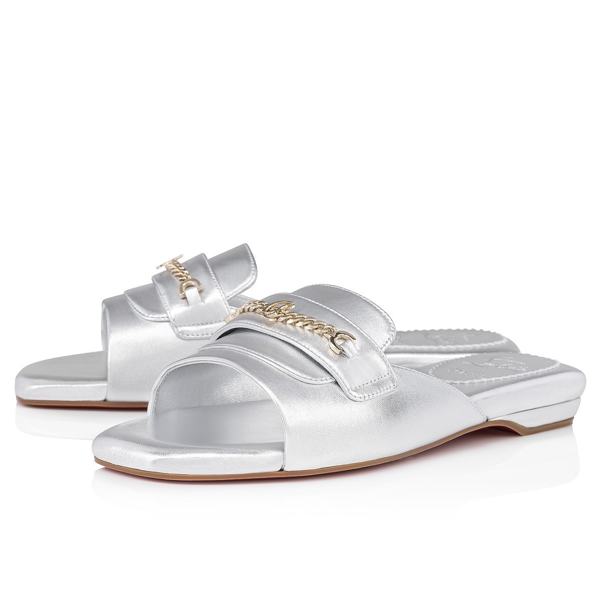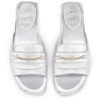 The elegant Miss MJ Mule sandal displays a chain on the upper. This open-toe design features sleek lines echoing the codes of a loafer. It is crafted in laminated silver leather. Both urban and elegant, it also bears a Maison Christian Louboutin CL logo. Product information Material: Nappa leather Color: Silver Reference: 1240821S211 Collection: Summer 24