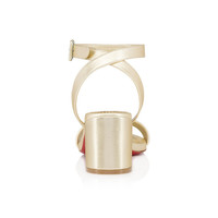 The iconic Miss Sabina is back, now with a padded insole and reworked 55 mm Turela heel. Its curvy lines reveal Maison Christian Louboutin's signature red sole to its full effect. This style is ideal for all-day wear. It features an elegant strap across the toe and another winding around the ankle that fastens with a buckle. It is crafted in Platine silver nappa leather with tonal lining. Product information Material: Nappa leather Color: Gold Reference: 3230388G306 Heel height: 55 mm Collection: Fall Winter 23