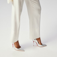 The tapered silhouette of the Miss Z pump offers sophistication. Set on a 100 mm stiletto heel that reveals the iconic red Loubi sole, this model from the bridal collection by Maison Christian Louboutin is made from silver lame nappa leather. This model features a new 'Everlasting Red Sole' thanks to an innovative coating technique that ensures resistance and lasting vibrancy for our signature Louboutin red. Product information Reference: 1250945S211 Color: Silver Material: Laminated nappa leather Heel Height: 100 mm