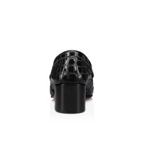 Combining style and comfort, the MJ MOC takes the Maison Christian Louboutin iconic moccasin to another level with a 50 mm block heel. Crafted from black alligator embossed calf leather, the tongue is accented with a gold chain featuring the CL mooncrest. The Loubi red sole and a square toe complete the smart-informal look. Product information Reference: 3240190B439 Color: Black Material: Calf leather Heel Height: 50 mm Collection: Fall Winter 24