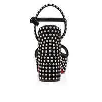 A sandal with an urban silhouette, the Movida Jane Strass Boum showcases a wide, 130 mm angled heel. Crafted in black veau velours adorned with silver strass, it features a rounded toe and Maison Christian Louboutin's signature daring low-cut vamp. Two slim straps with a metallic clasp, delicately adorn the foot and delicate details add an elegant finishing touch. Product information Material: Veau velours Color: Black Reference: 1240664T023 Heel height: 130 mm Collection: Summer 24